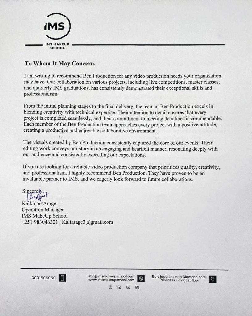 I am writing to recommend Ben Production for any video production needs your organization may have. Our collaboration on various projects, including live competitions, master classes, and quarterly IMS graduations, has consistently demonstrated their exceptional skills and professionalism.